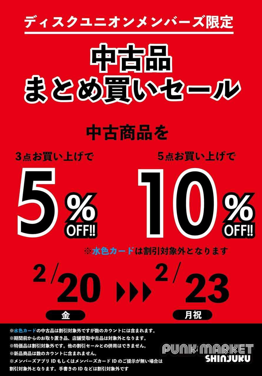 2026年02月19日 2/20(金)-2/23(月・祝)メンバーズ中古まとめ買いセール 新宿パンクマーケットでは中古品をまとめて3点以上お買い上げで5%OFFまとめて5点以上お買い上げで10%OFF水色カードは割引対象外となります。※水色カードは割引対象外となりますが数のカウントには含まれます。※店舗受取中古品は割引対象外です。※特価商品は割引き対象外です。※他の割引セールとの併用は不可となります。※メンバーズアプリIDもしくはメンバーズカードIDのご提示が無い場合は割引対象外となります。手書きのIDなどは割引対象外です。 カテゴリなしの他の記事 ★PUNK新譜新入荷情報★2026/2/19少量ですがT-SHIRT入荷!!